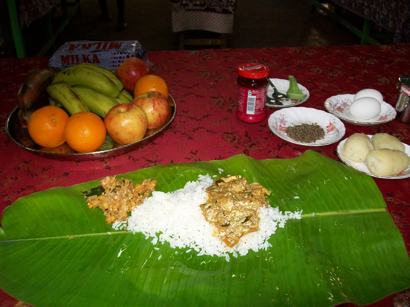 Dann ging es mit Mr. Nixon zurück zu unserer Bleibe, dem wirklich komfortablen Gästezimmer im Polioheim in Neyyoor, nur fünf Minuten vom Krankenhaus entfernt. Das Frühstück noch kaum verdaut, wurden wir erneut zu Tisch gebeten. Sehr schmackhaftes, natürlich für uns entschärftes aber immer noch "sehr würziges" indisches Essen, aus den frischesten Zutaten die man sich denken kann, stilecht aus Blecheimern auf einem Bananenblatt serviert. Es schmeckt wunderbar und die indische Gastfreundschaft erträgt es manchmal kaum, wenn man nach zwei Tellern/Blättern, eigentlich noch völlig gesättigt vom reichhaltigen Frühstück, einfach nichts mehr essen kann.